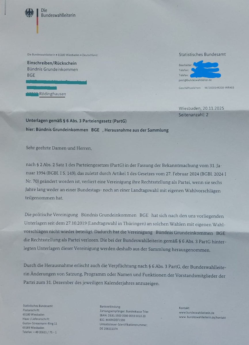 20.11.2025: Brief vom Bundeswahlleiter: BGE-Partei: Rechtsstellung als Partei verloren